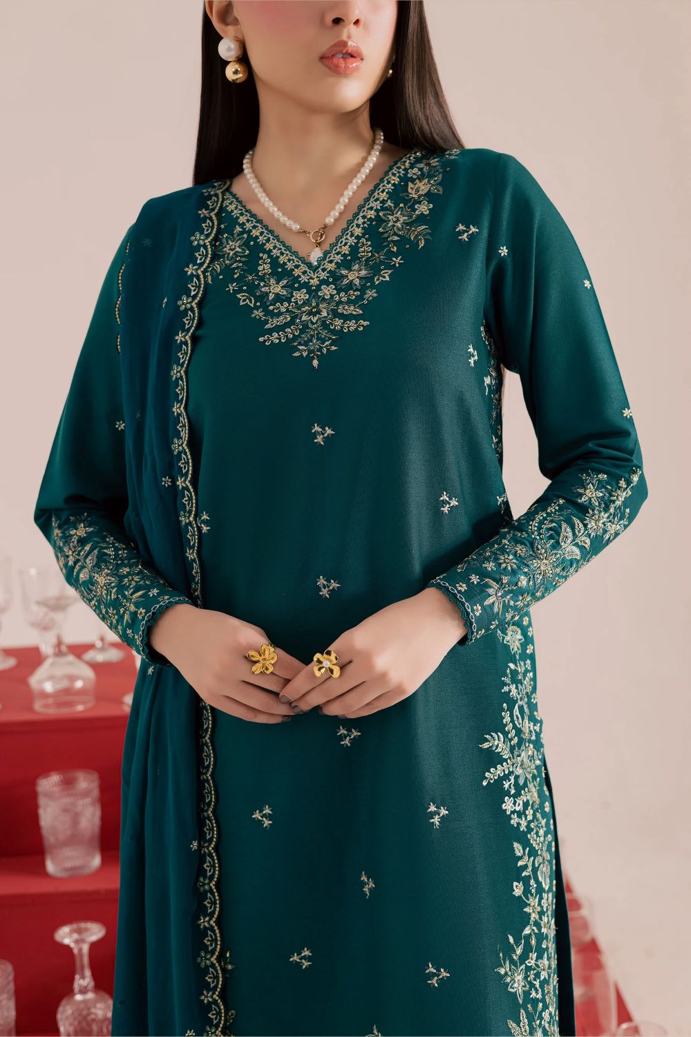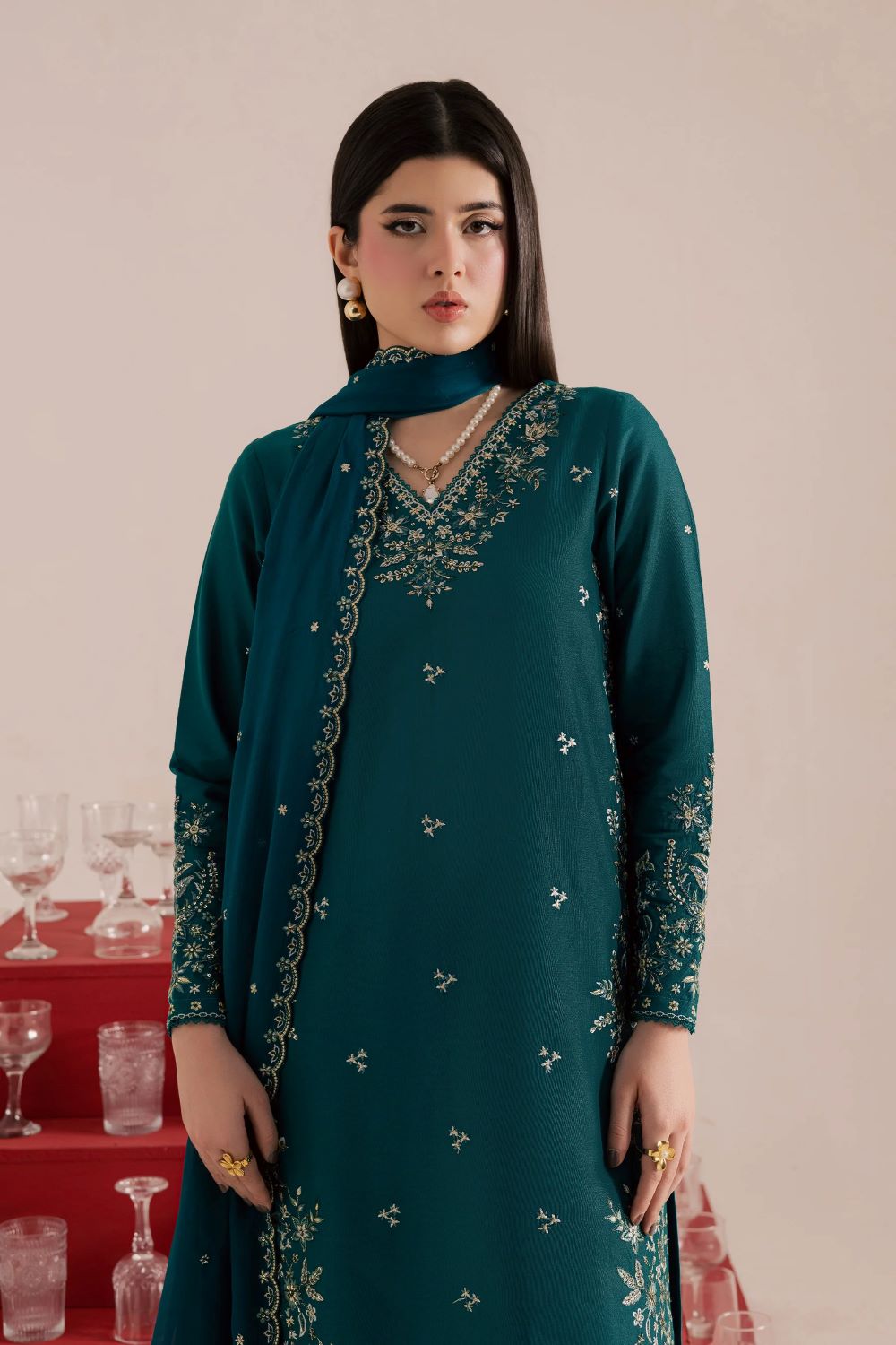 This three piece shaded spruce khaddar set features a long shirt with a composed embroidered front and a graceful V neckline. The fitted sleeves carry matching composed embroidery, while the shirt is finished with lace at the neckline and hem for a refined finish.