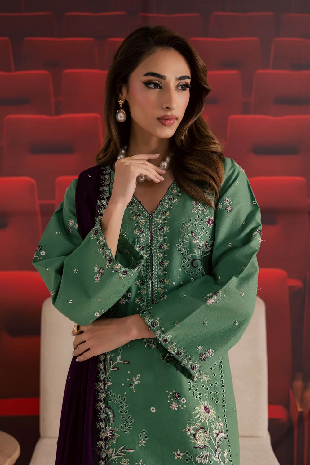 This frosty spruce three piece khaddar ensemble features a fully embroidered paneled shirt finished with delicate lace, giving it a soft and refined winter look. The detailed embroidery adds charm while keeping the silhouette clean and easy to style.