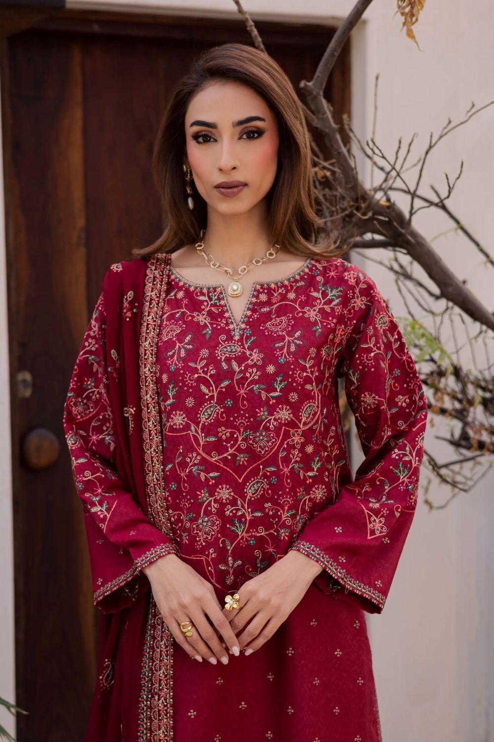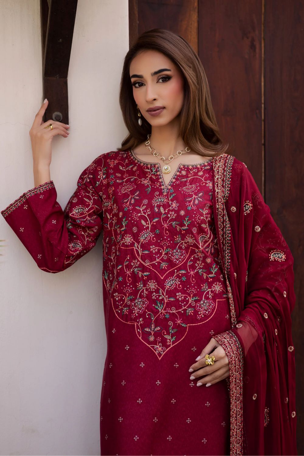An embroidered chiffon dupatta completes the ensemble, adding lightness and balance to the overall look.