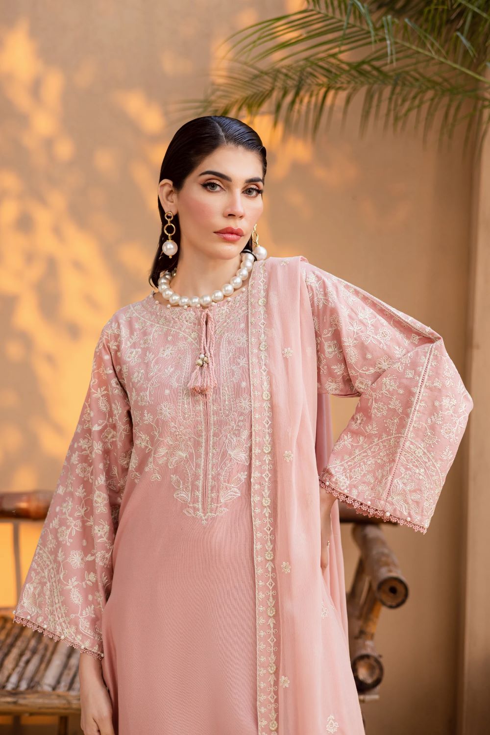 Completing the look is a delicately embroidered crinkle dupatta. Lightweight yet striking, it drapes beautifully, making the outfit versatile for festive gatherings and stylish day wear.