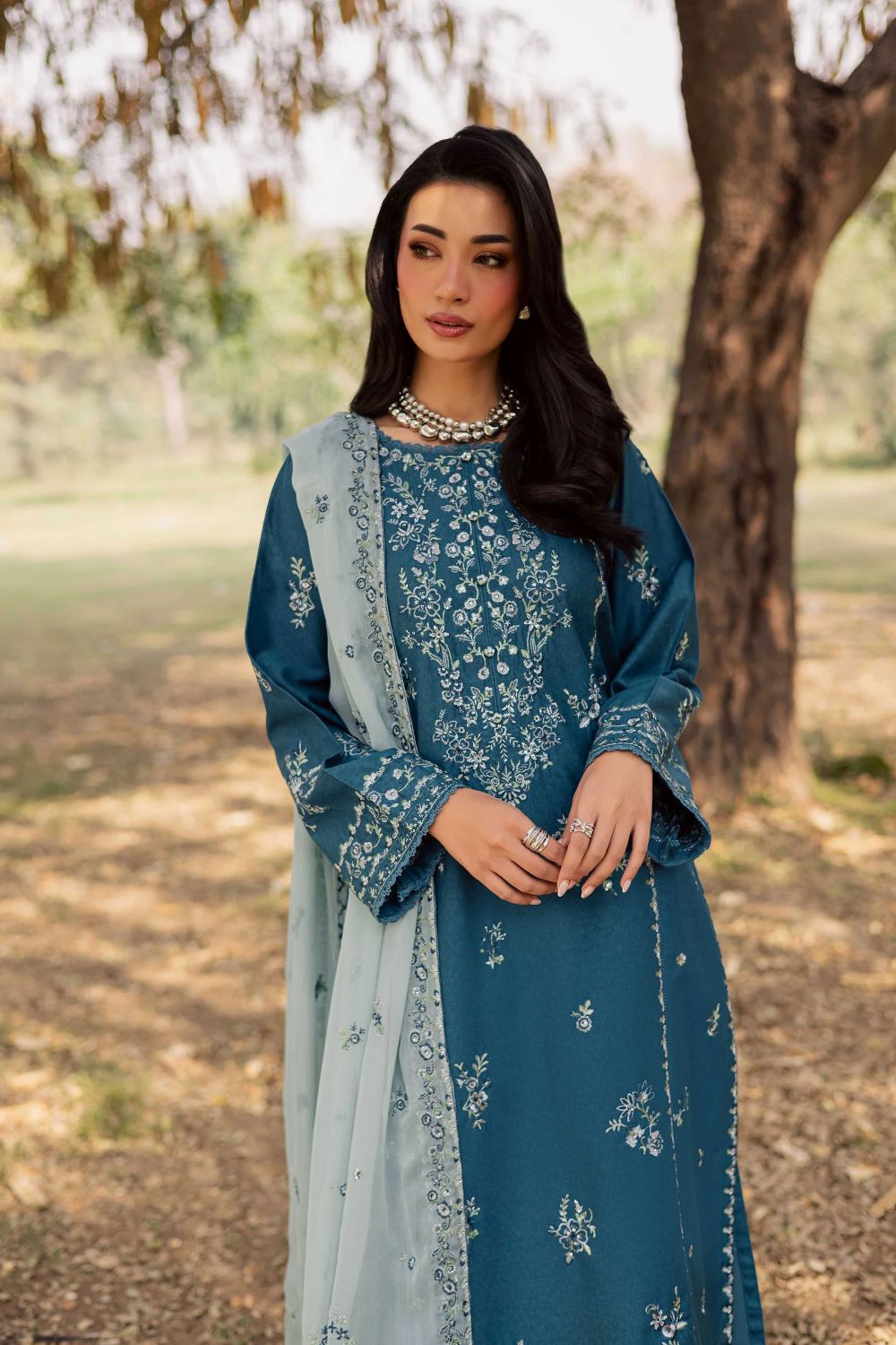 This whale blue three piece karandi ensemble features a fully embroidered flared shirt that brings softness and movement to the look. The sleeves are detailed with embroidery and finished with borders at the hem, adding a clean and refined touch.