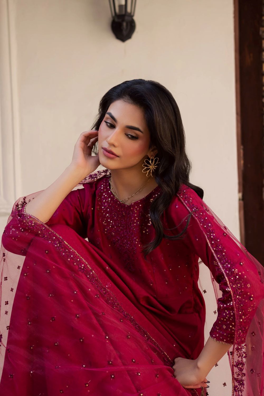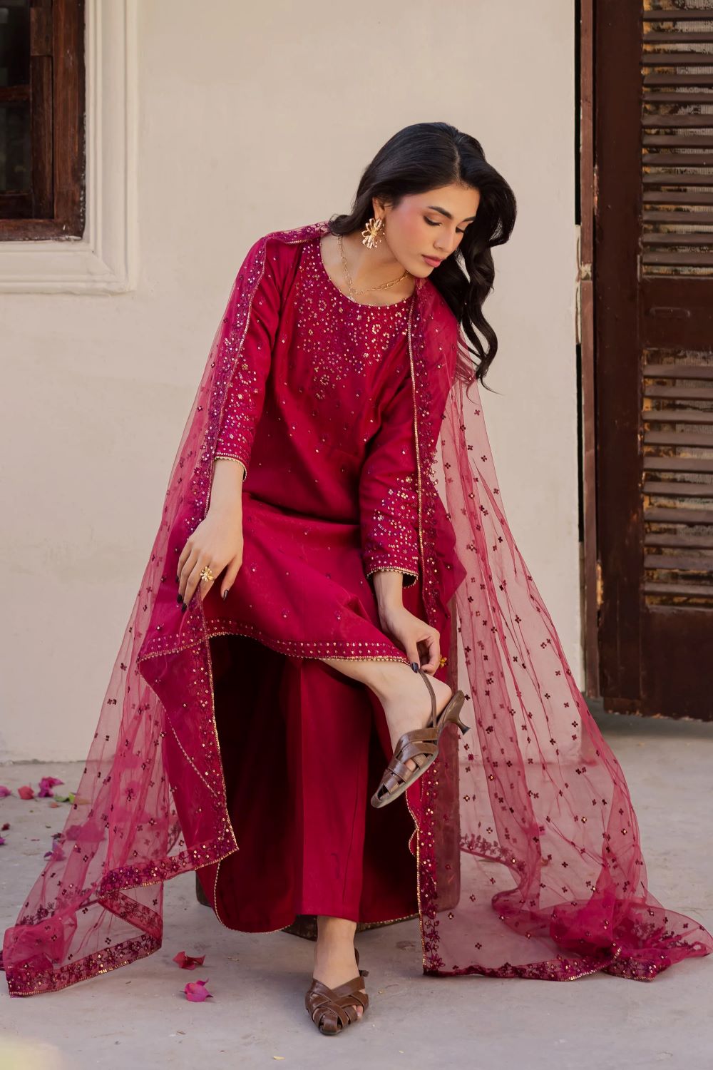 An embroidered net dupatta completes the ensemble, adding lightness and a refined finish to the overall look.