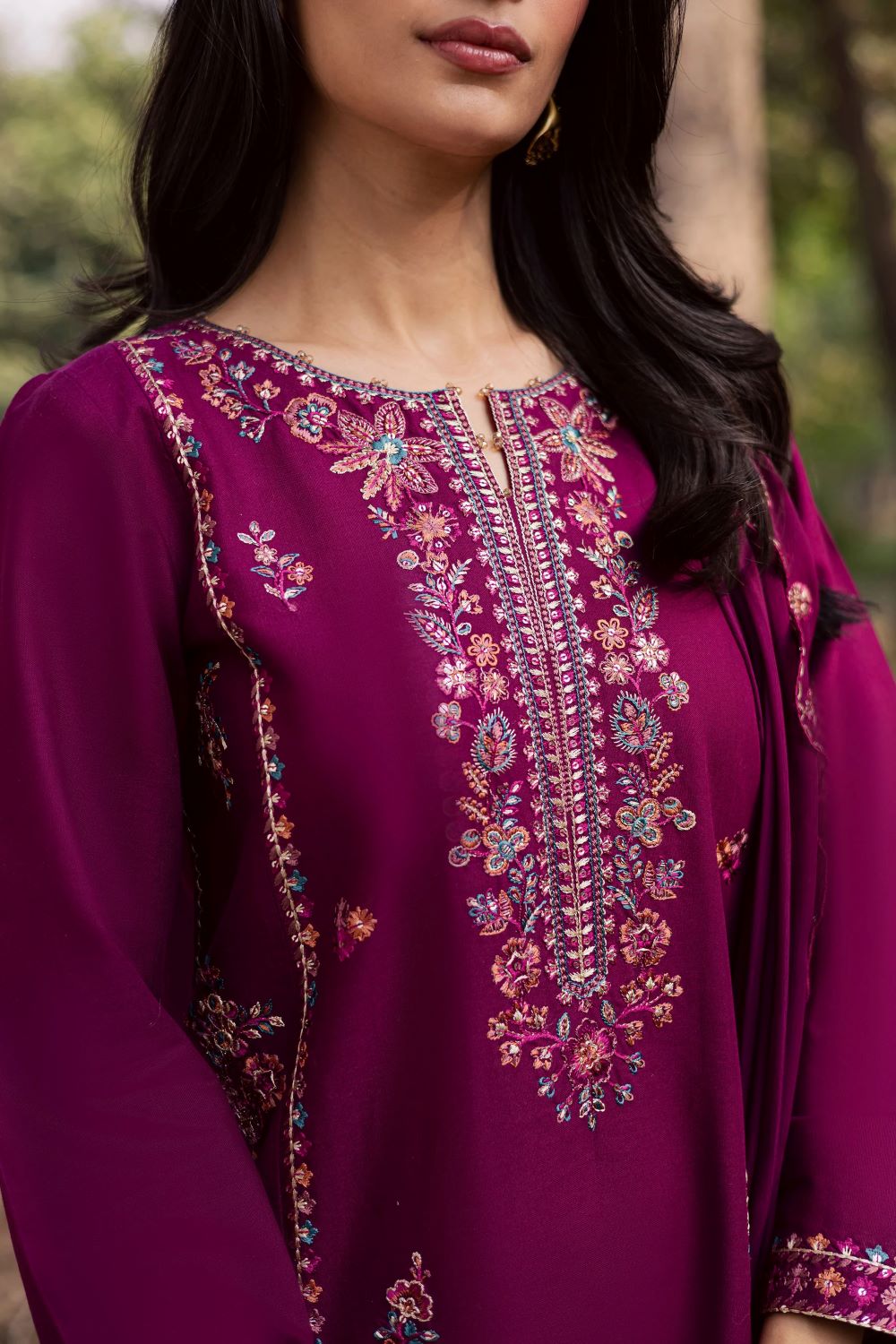 This elegant three piece ensemble features a panelled long embroidered shirt with a refined silhouette. The neckline is finished with a delicate crystal detail that adds a soft touch of sparkle, while the cuffs carry an embroidered border for a clean, polished finish.