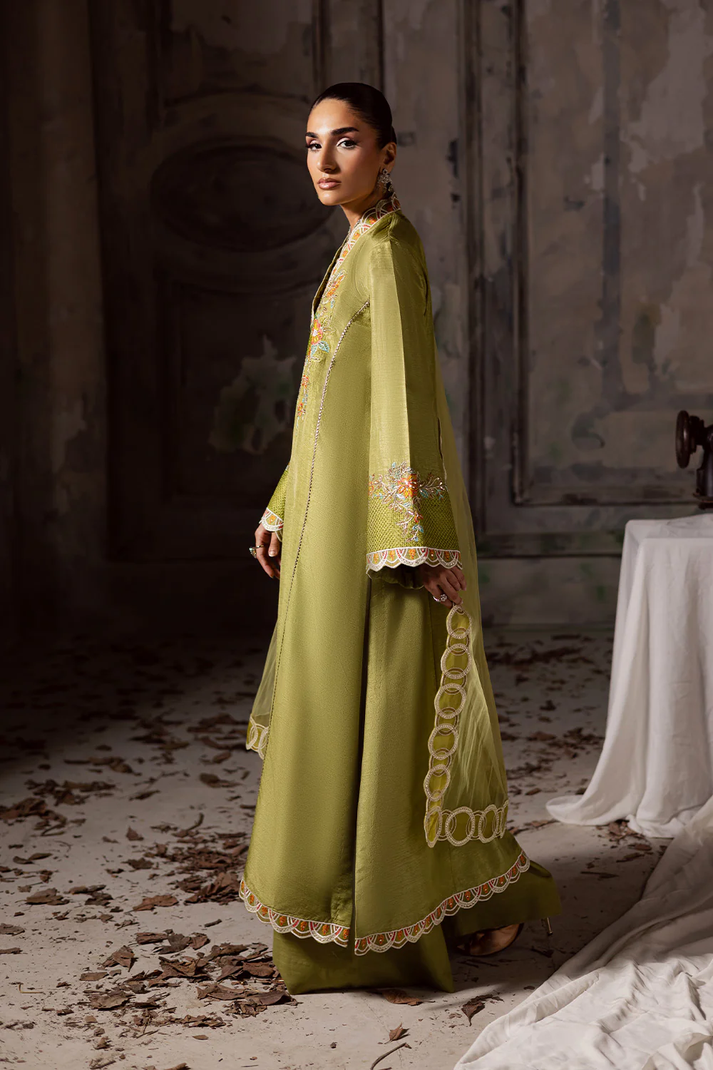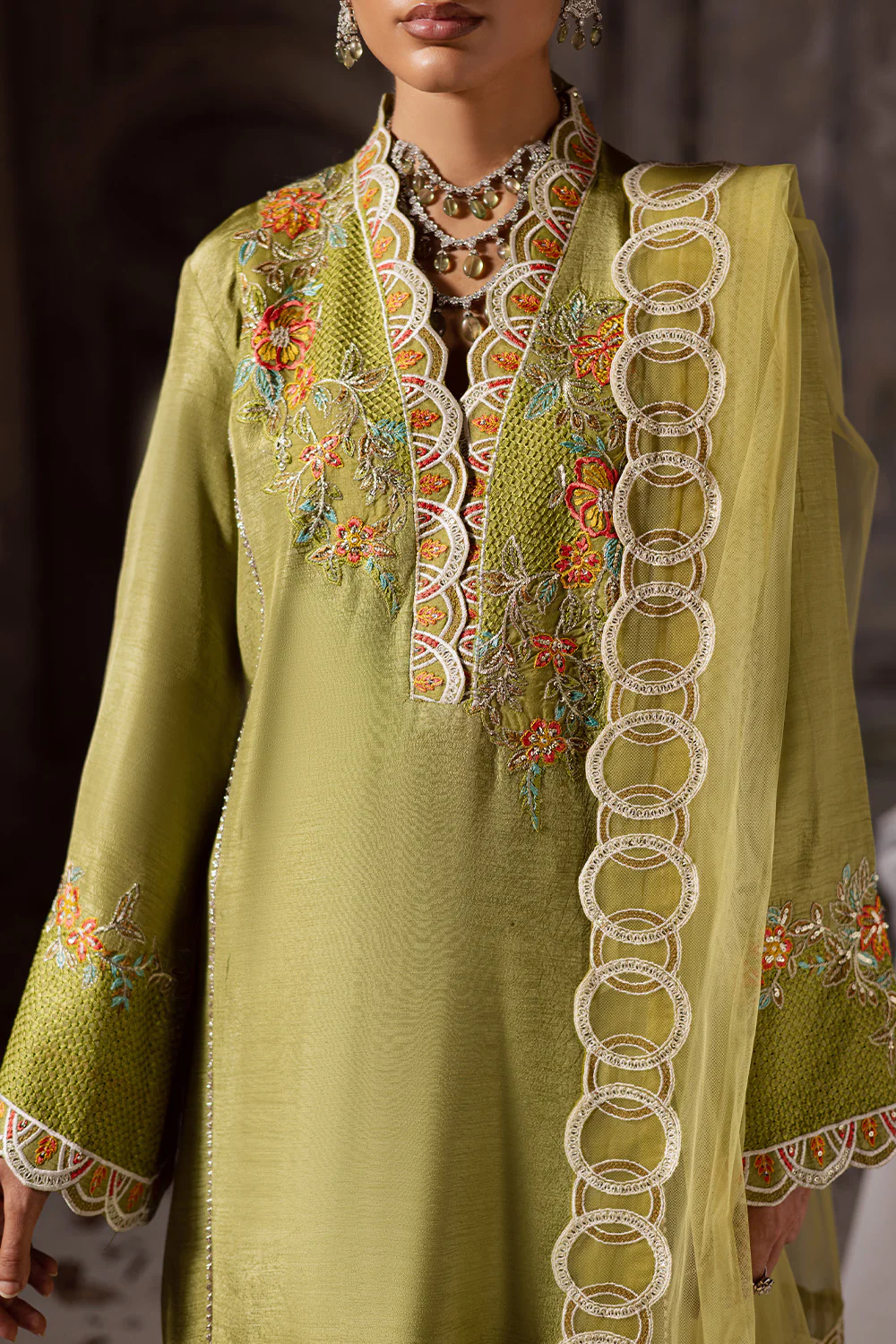 Exude refined elegance in this 3-piece Pret in Avocado Green, crafted from premium Russian Silk with a graceful Bareeze Net dupatta. The straight long shirt showcases a V-neckline with embroidered scalloped borders, enhanced by a delicate floral embroidery motif bunch at the front. Intricate lace detailing on the front panels and a scalloped embroidered hem bring a touch of sophistication. The full-length sleeves are adorned with wide embroidered cuffs and scalloped finishing for added charm. Flowing flared trousers balance the ensemble with modern flair. The look is completed with a net dupatta, designed with four-sided scalloped embroidered borders, making it perfect for festive and semi-formal occasions.