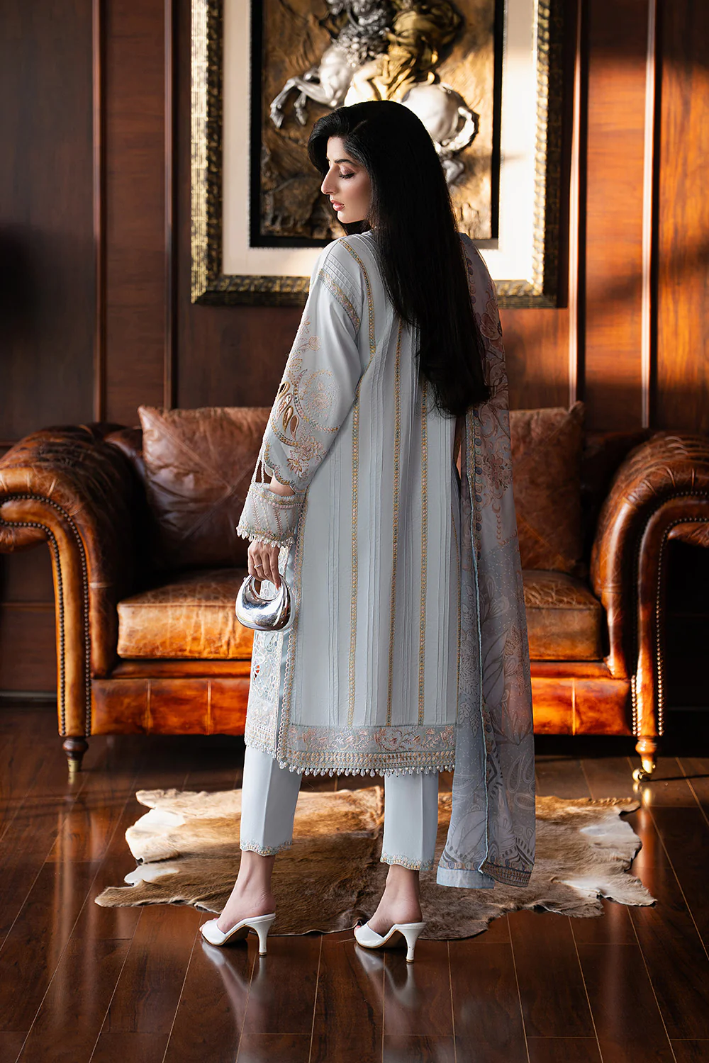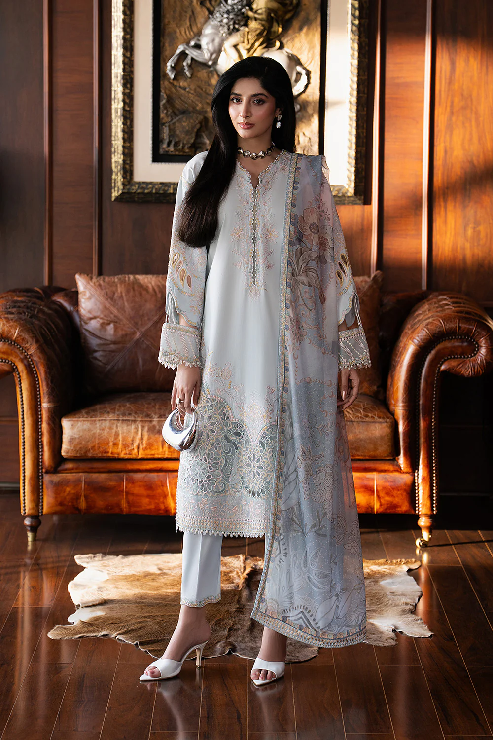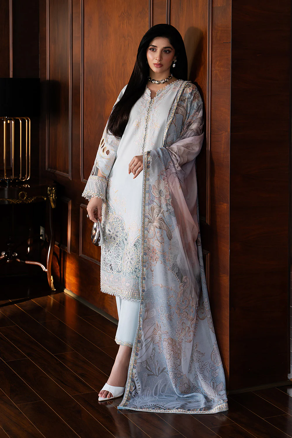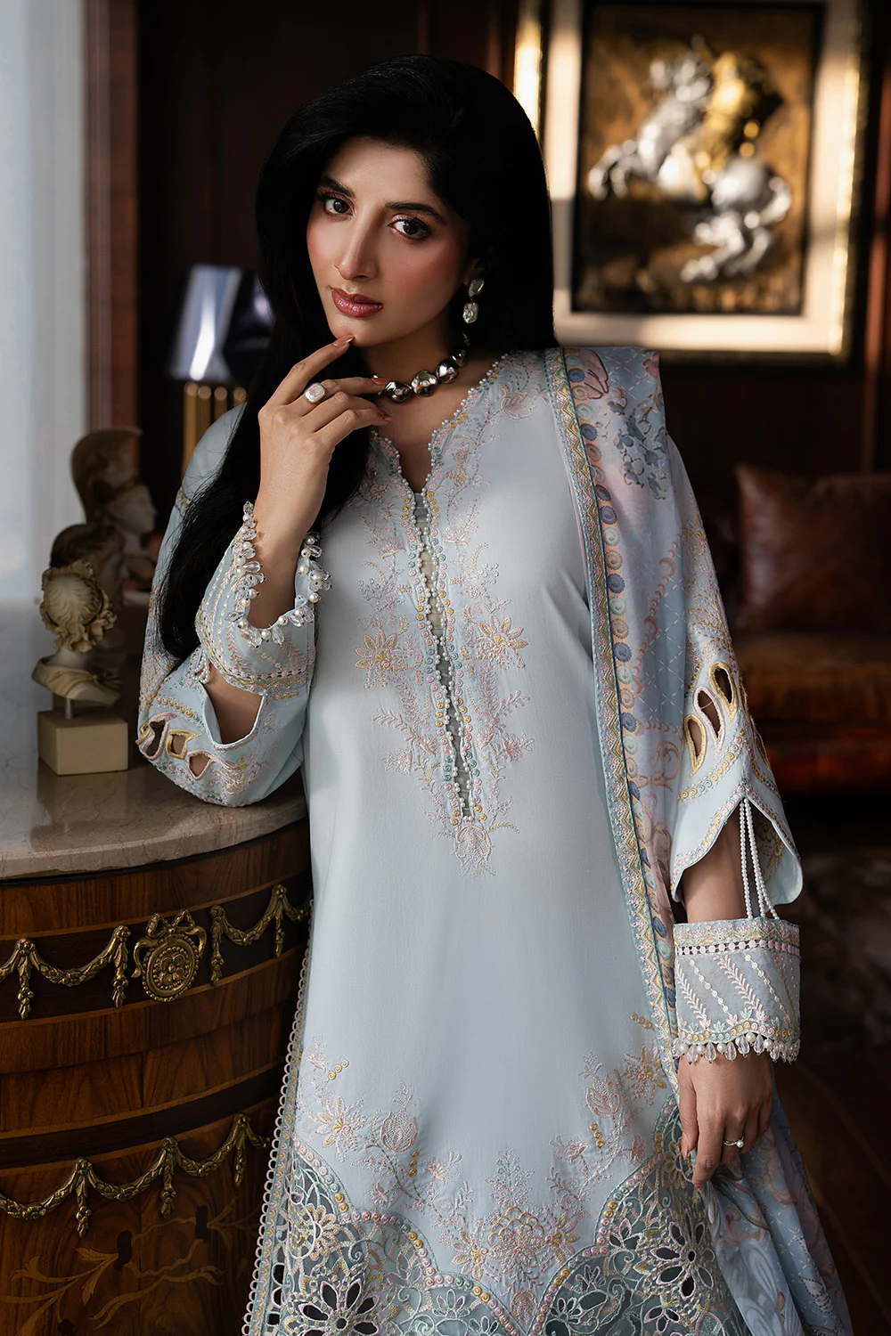 Opal Blue elegance meets effortless sophistication in this 3-piece prêt ensemble, crafted for the modern muse. The lawn shirt features an exquisitely embroidered V-neckline adorned with delicate lace and pearl accents, complemented by long, loose sleeves with intricate cutwork and organza appliqué. Designed in a chic boxy silhouette with drop shoulders, it pairs seamlessly with straight-fit cambric cotton pants for refined comfort. A printed medium silk dupatta, framed with four-sided embroidered borders, completes this timeless statement of grace.